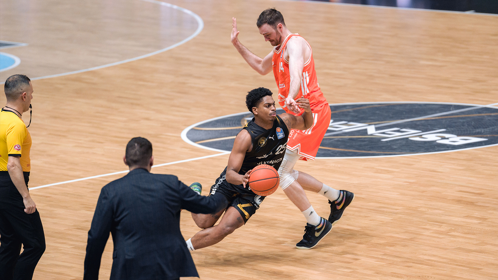 Das änderte sich im zweiten Spielabschnitt schlagartig. Grant Sherfield, David N’Guessan und Ferdi Zylka versenkten drei Dreier in Folge und im Nu lag das Papazoglou-Team vorne (30:23, 15. Min.). Jetzt machte sich auch die hohe kollektive, defensive Aufmerksamkeit in Kombination mit dem schnellen Spiel nach vorne bezahlt. Durch das Tempo von Barra Njie und Co. rissen die Löwen immer wieder Lücken und fanden gute Wurfoptionen. Und auf der anderen Seite? Da blieb das gefährliche Guard-Duo um den Liga-Topscorer Alonzo Verge Jr. und Tevin Brown blass. Die Löwen hatten sich vorgenommen, beide zu kontrollieren. „Das ist uns gut gelungen“, sagte der Löwen-Headcoach nach dem Spiel. Verge und Brown hatten zur Halbzeit zusammen nur neun Punkte erzielt.